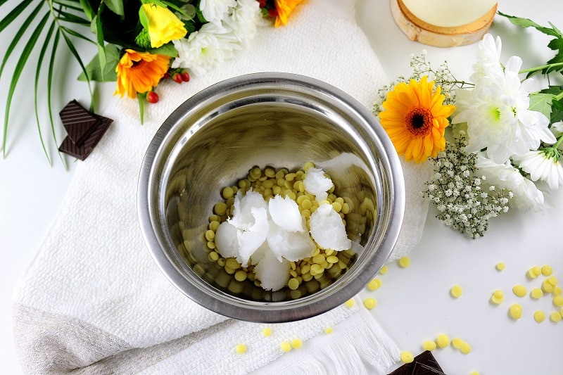 Pour ce DIY, j’ai d’abord utilisé le beurre végétal de cacao blanc en pastilles. J’ai trouvé le mien chez Zodio mais je pense que vous pouvez en trouver en magasin bio ou chez Aromazone. Le beurre de Cacao est issu des fèves du cacaoyer, les cabosses, arbre originaire d’Amérique centrale ou d’Afrique. Après fermentation et torréfaction, les amandes sont pressées pour obtenir le cacao en poudre d’une part, le beurre de Cacao d’autre part. Il permet aussi d’apporter de la consistance aux cosmétiques.