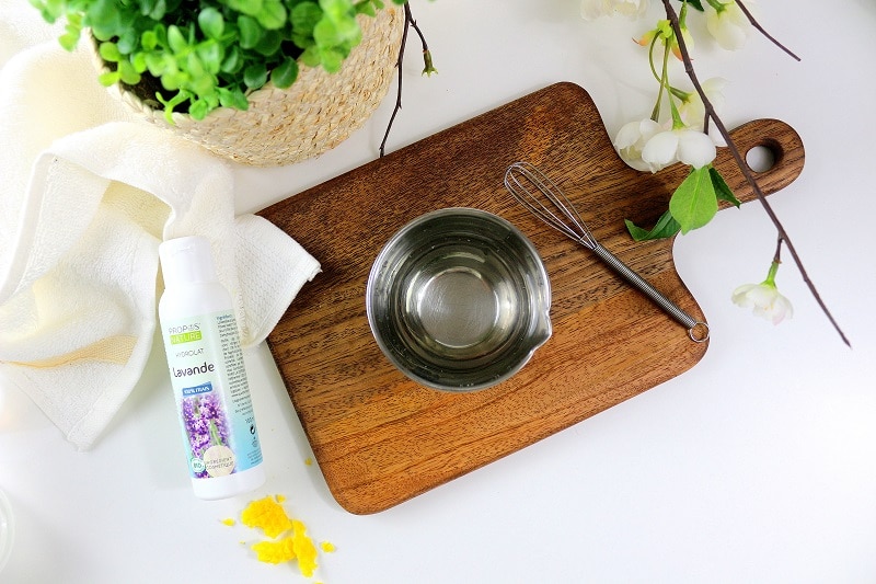 - Dans un autre bol, verser l’eau florale et faites la tiédir au bain marie.